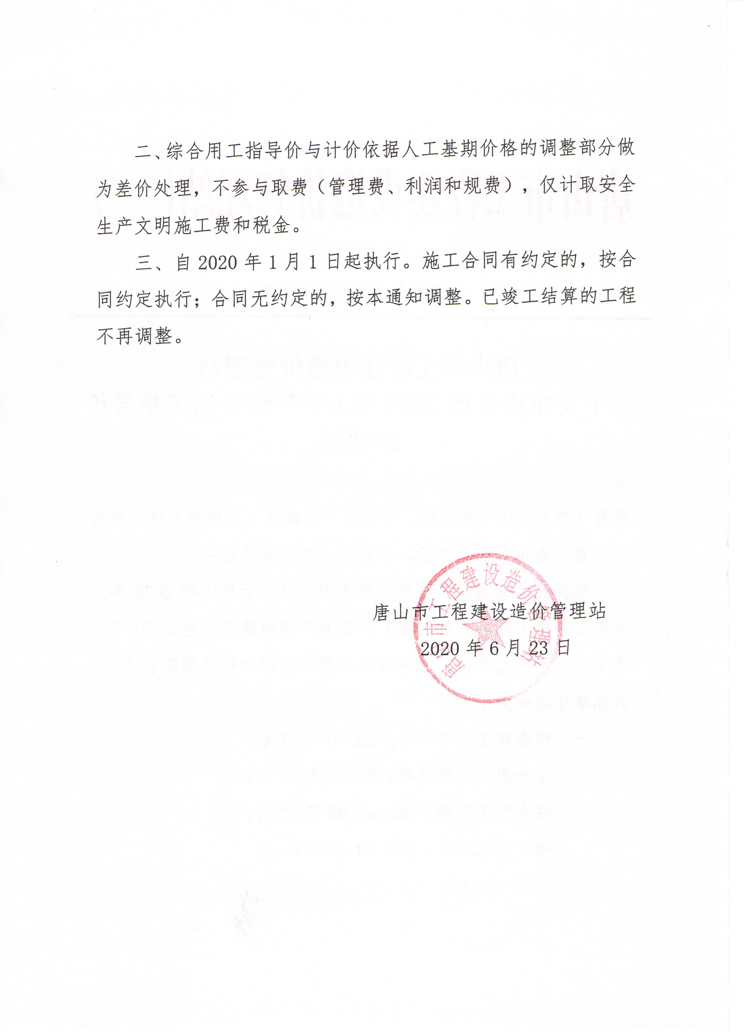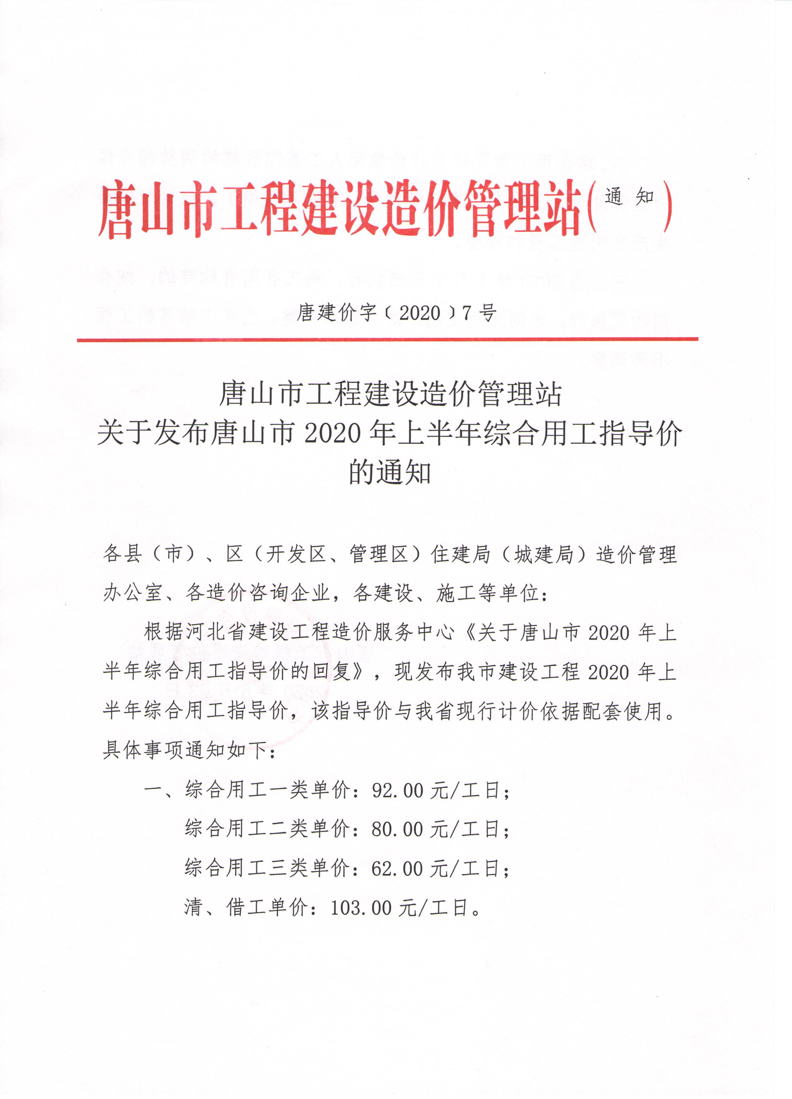 唐山市工程建设造价管理站 关于发布唐山市2020年上半年综合用工指导价的通知