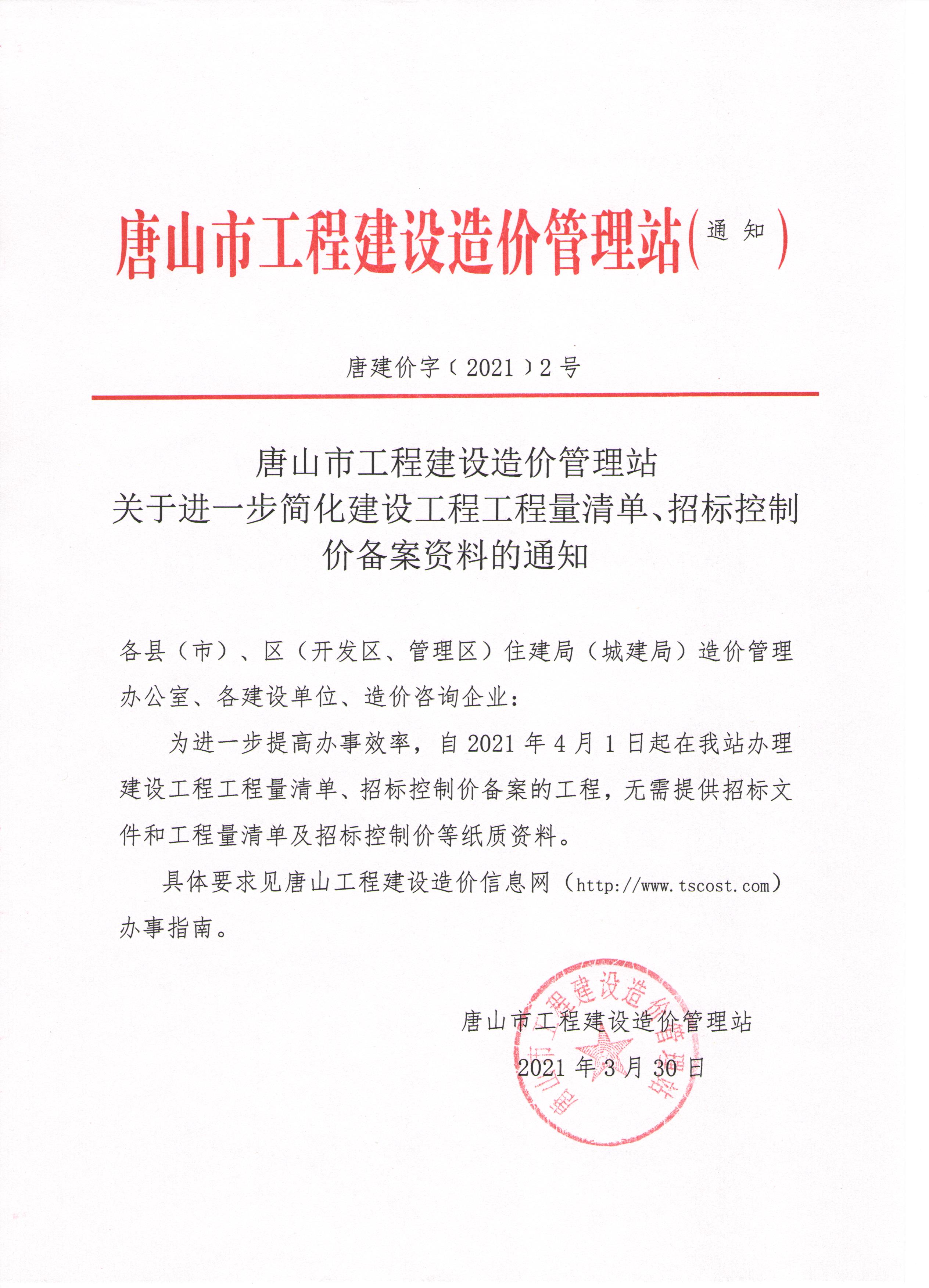 唐山市工程建设造价管理站关于进一步简化建设工程工程量清单、招标控制价备案资料的通知
