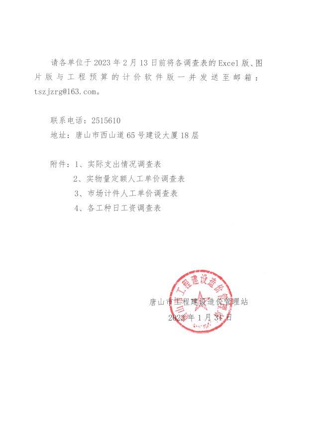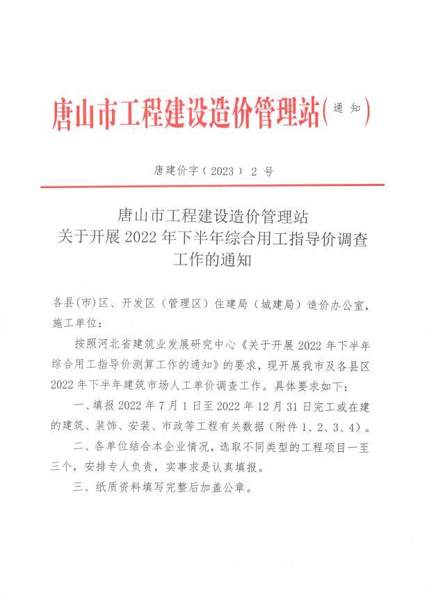 唐山市工程建设造价管理站关于开展2022年下半年综合用工指导价调查工作的通知