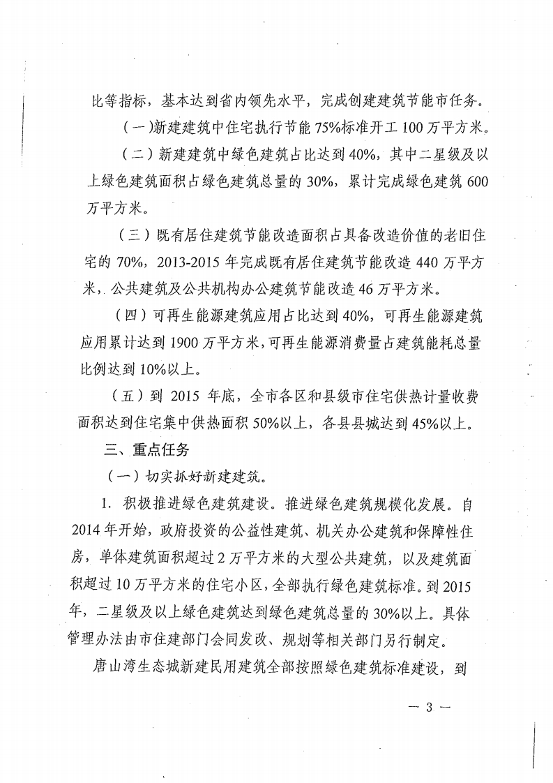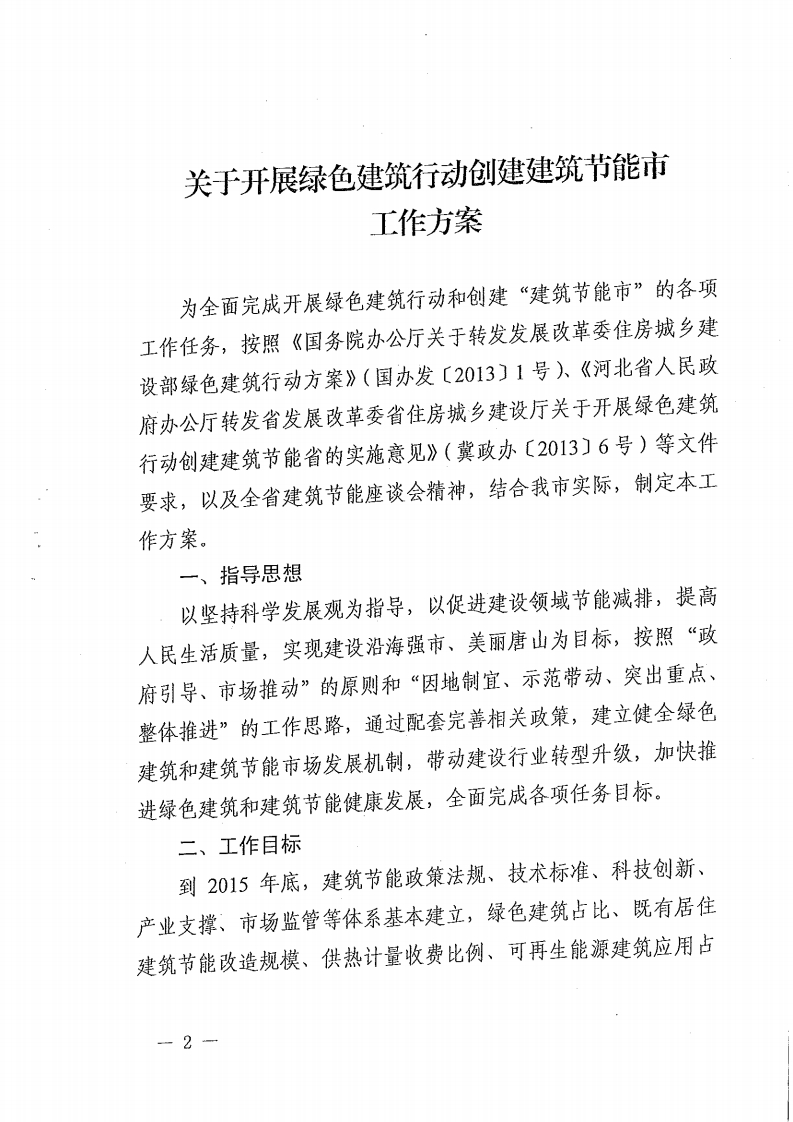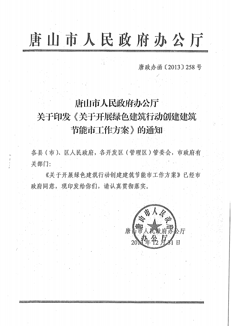 唐山市人民政府办公厅关于印发《关于开展绿色建筑行动创建建筑节能市工作方案》的通知(唐政办函[2013]258号)